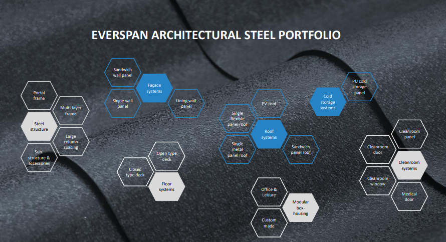 Everspan is mainly specialized in such businesses as manufacturing of architectural steel products and cold rolled steel, as well as the trade of coated steel sheets. State -level SRDI (specialized, refined, distinctive, and innovative) Little Giant Enterprise, which is a specialized manufacturer and service provider of metal cladding system and steel structure products. The production lines that have been put into operation, including sandwich panel, curtain wall, PU cold storage panel, cleanroom panel, cleanroom doors and windows, all employ state -of -the -art equipment, technologies and production management systems, with product lineup covering: Façade Systems, Roof Systems, Floor Systems, Steel Structure, Cleanroom Systems, Cold Storage System, Modular Housing and more. We always uphold the operation philosophy of Mutual Success Through Sincerity and Integrity, and have thus earned the respect and recognition of customers, peers and all walks of life through exquisite craftsmanship and a sincere attitude.